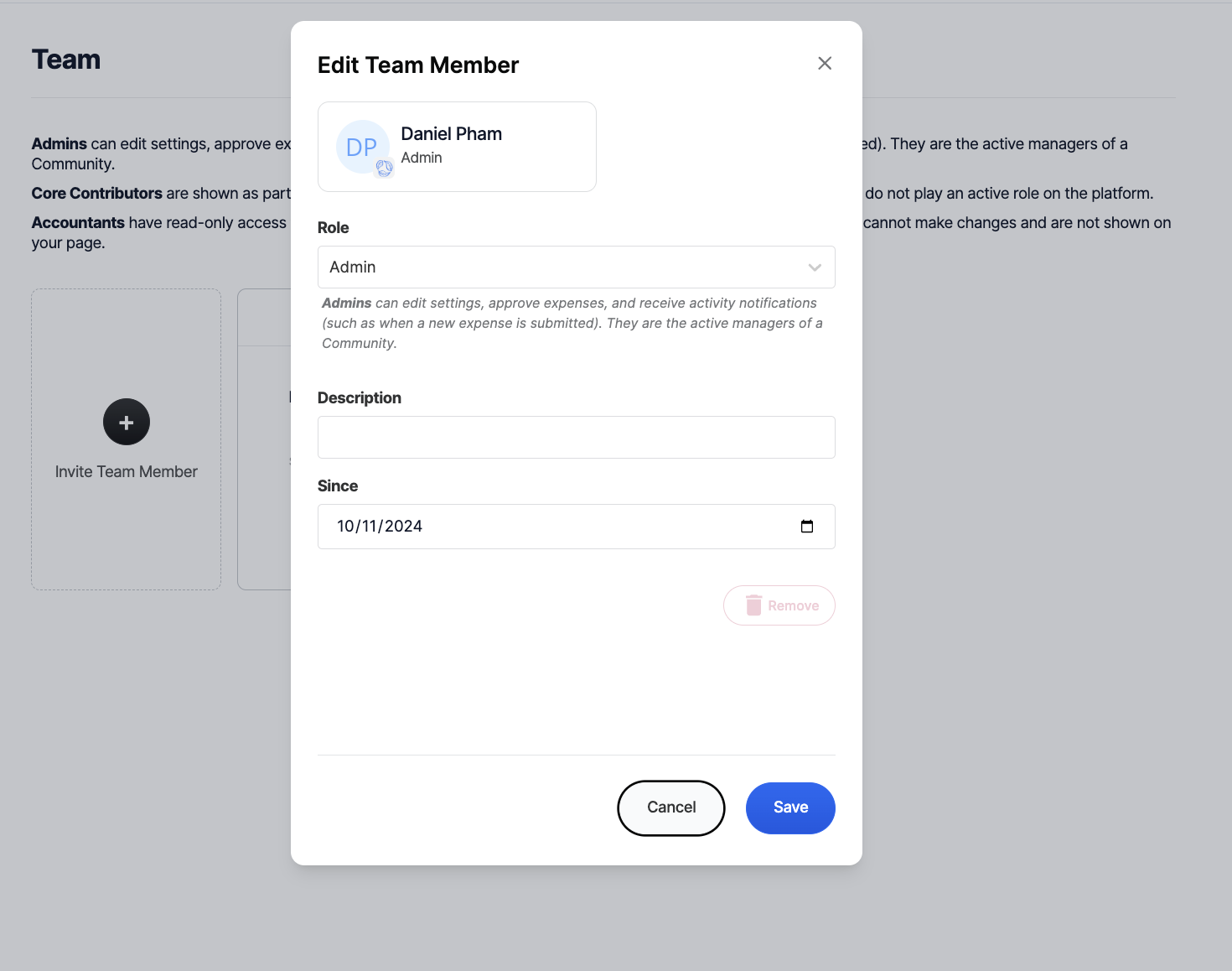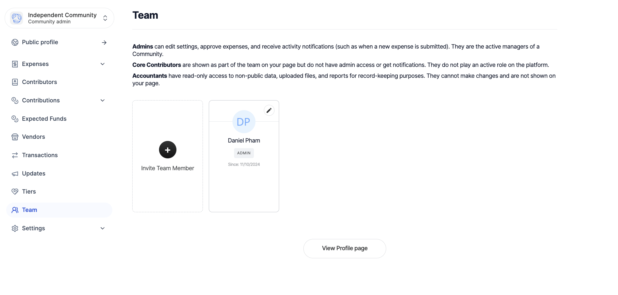 Core contributors show up in the Team section of your page and can create events, but can't change settings or approve expenses.