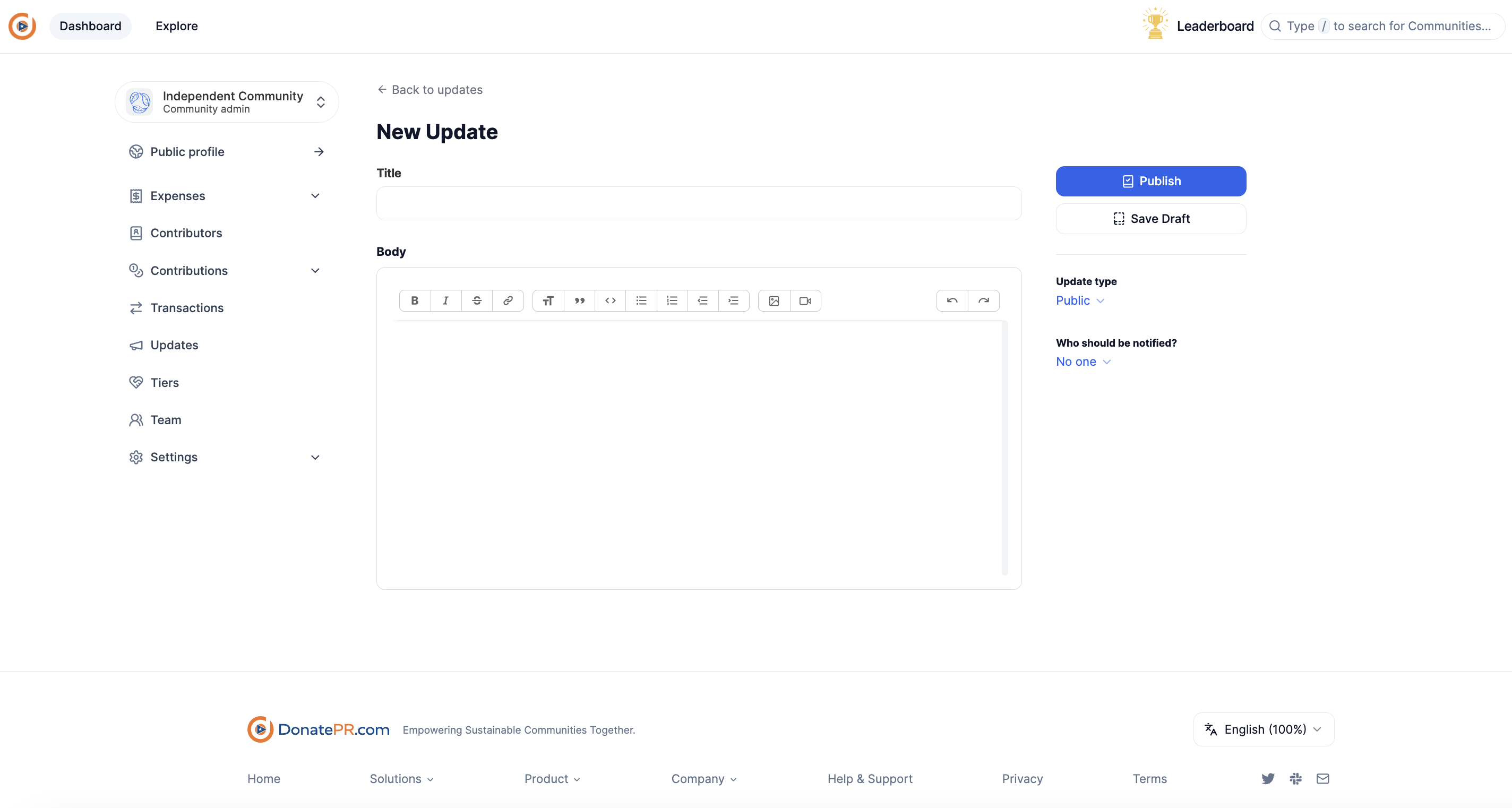 To create an Update, go to your Dashboard, navigate to the **Updates** section and click on **Create Update**. Updates will appear in the Connect section of your public Community page and you have the option to also notify your community admins and/or contributors via email.