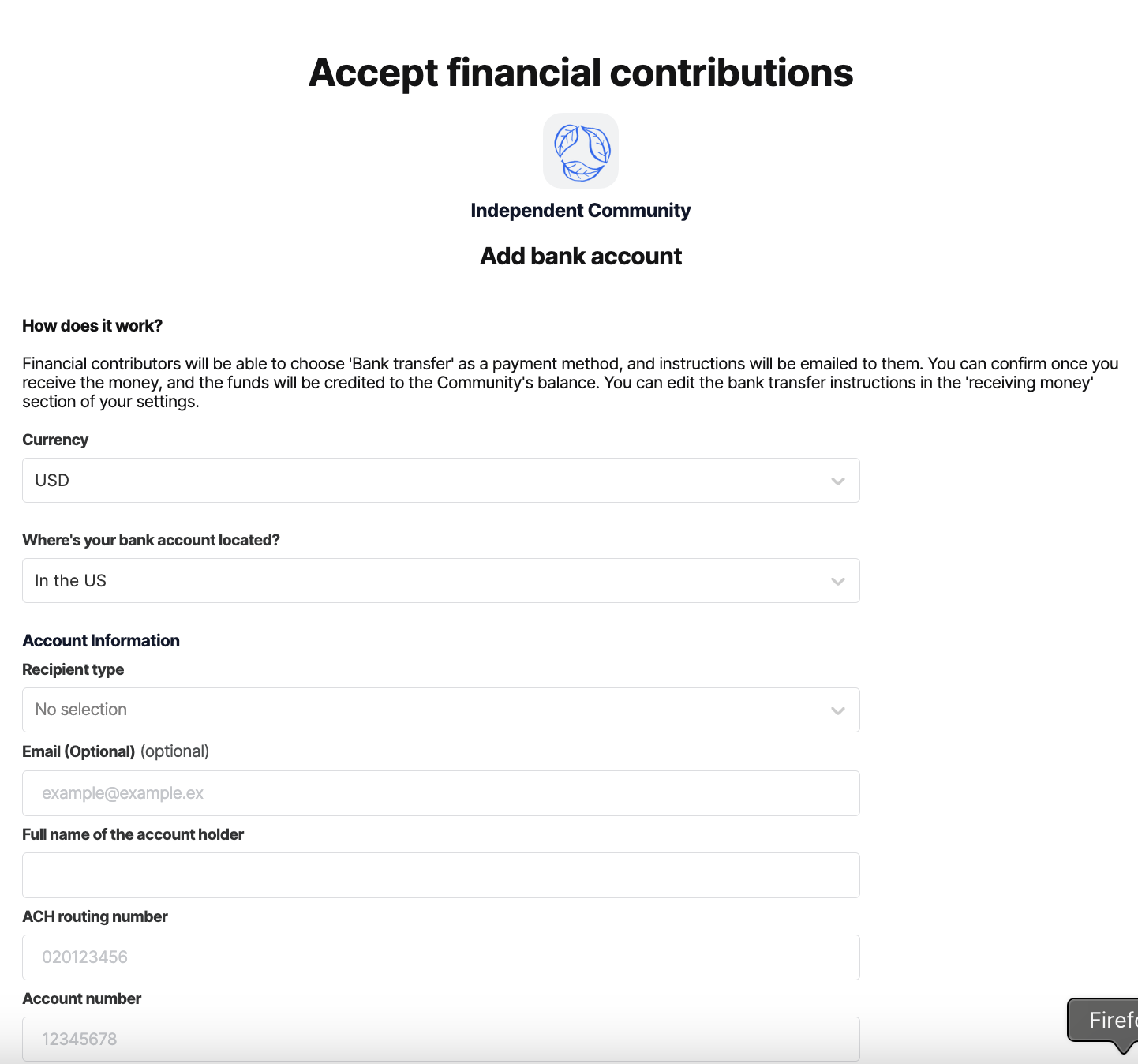 To receive financial contributions, you have to connect a **Stripe** account and/or add a **bank account**.