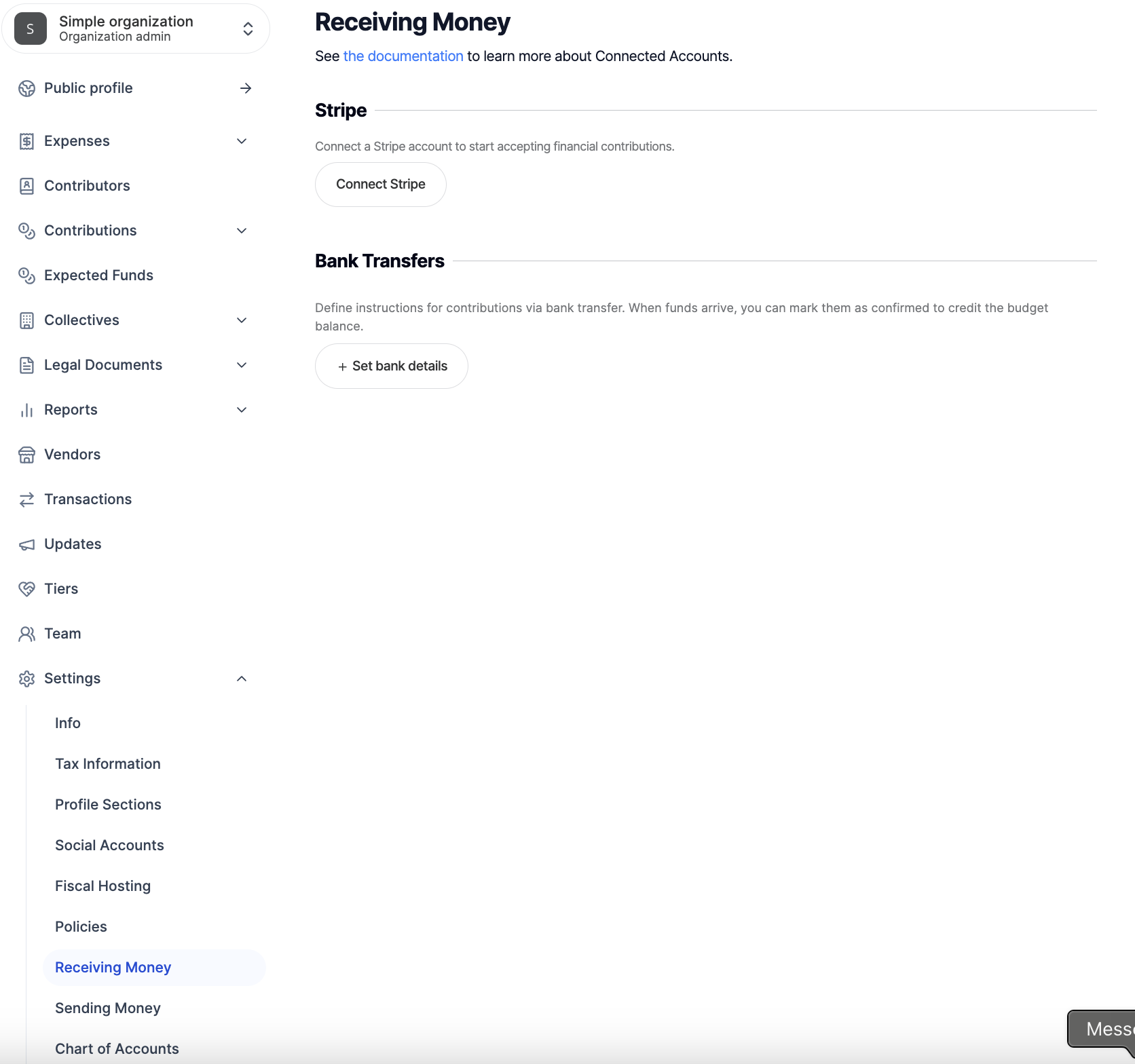 Don't forget to go to **Receiving Money** and activate a method for people to give money to your Communities, either credit cards (via Stripe) and/or bank transfers.
