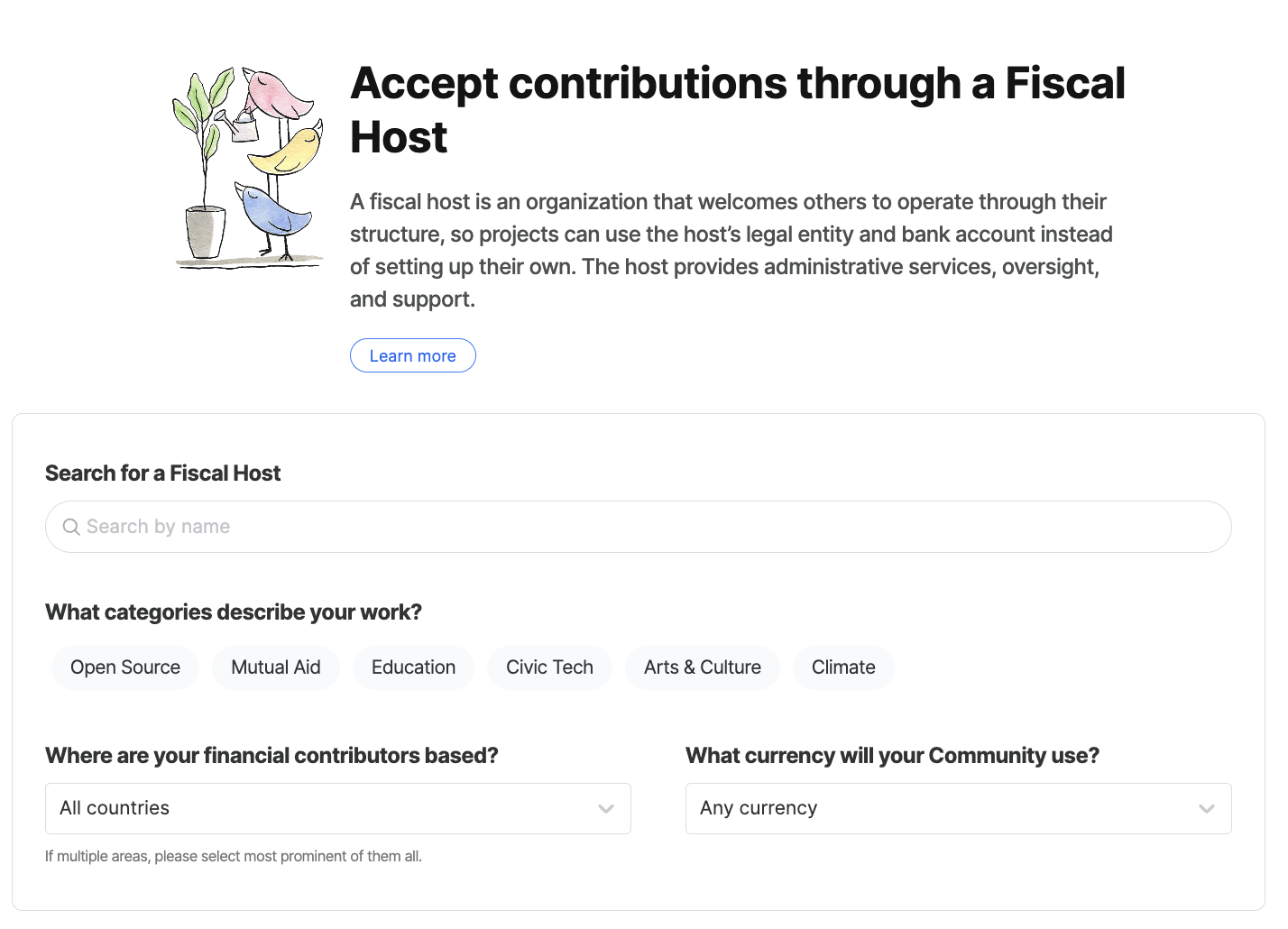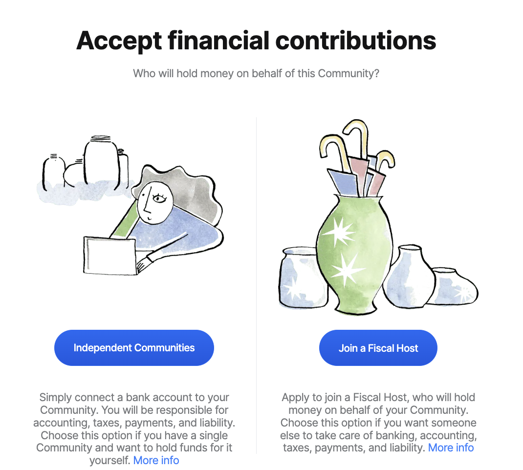 ![A message on your Community page prompting you to choose a Fiscal Host.](https://1948397550-files.gitbook.io/~/files/v0/b/gitbook-x-prod.appspot.com/o/spaces%2FuNQPJeCQS3kEc00OAwaT%2Fuploads%2Fgit-blob-6d57ef851cce6fe0116148097d47108b98ea1d3c%2FScreen%20Shot%202020-08-28%20at%2010.38.52%20AM.png?alt=media)