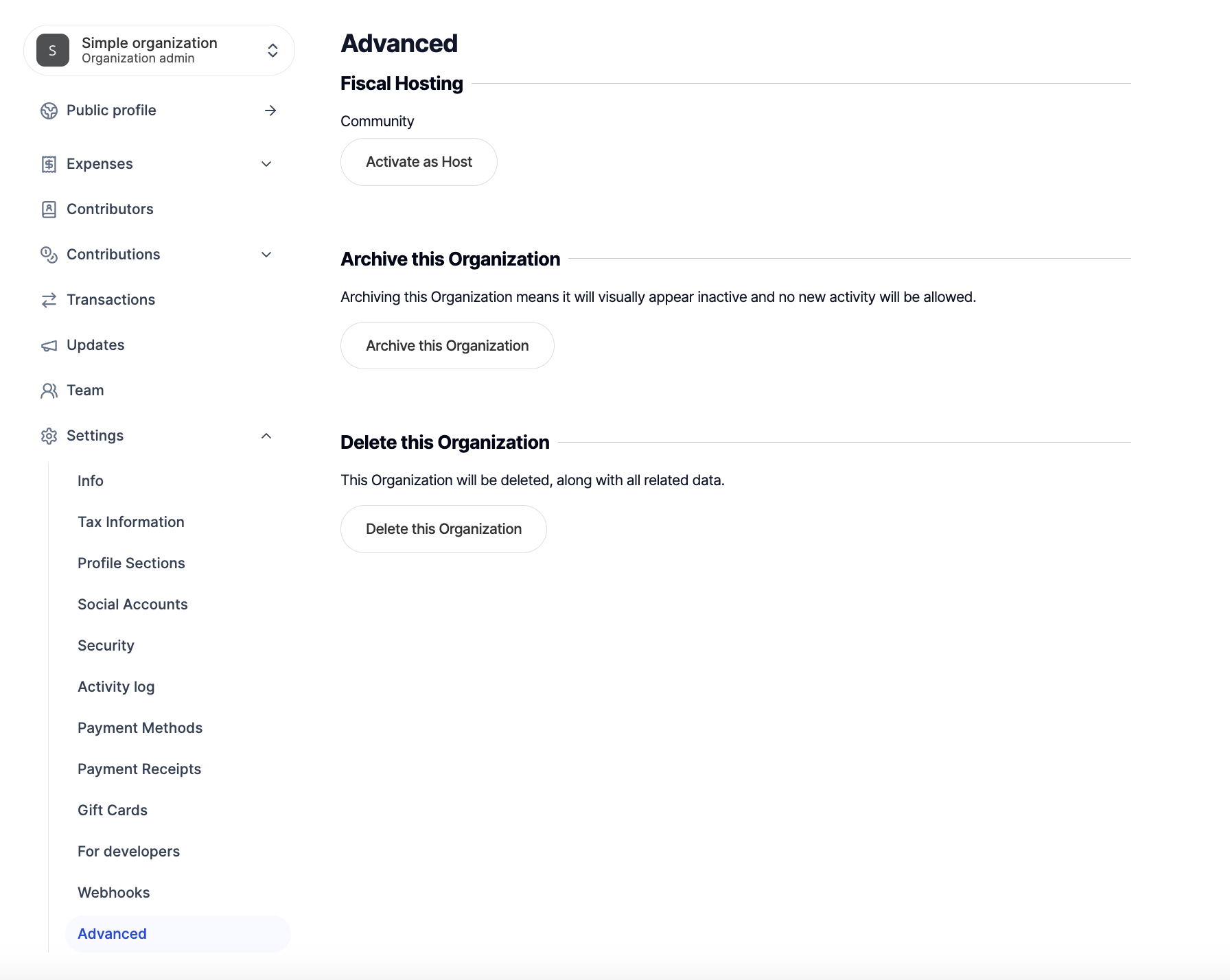 Once your Organization is created, go to **Settings** > **Fiscal Hosting** and click on **Activate as Host**.