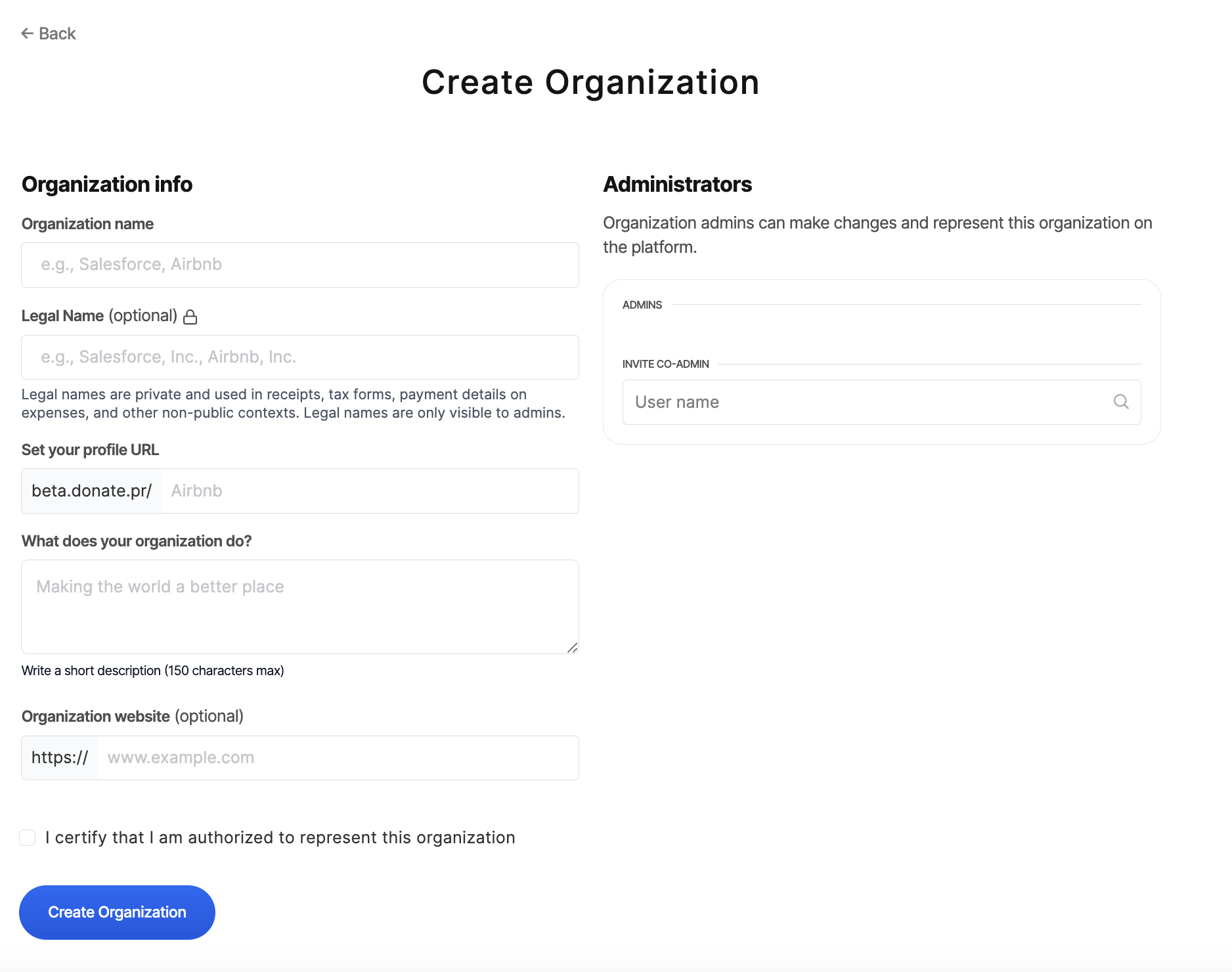 If you don't have an account yet, please [create one](https://donatepr.com/create-account). You need an individual account to be able to create a Fiscal Host — so fill the form with the info of the **individual** **administrator** of that Fiscal Host.