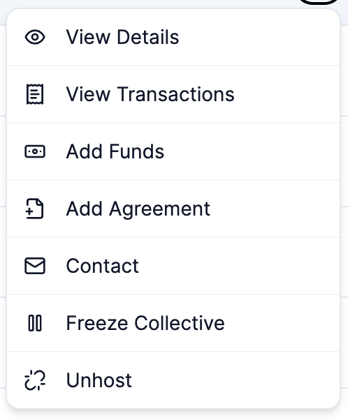 Click on the three dots to View Details, View Transations, Add funds, Agreements, Contact, Freeze or Unhost the Community.
