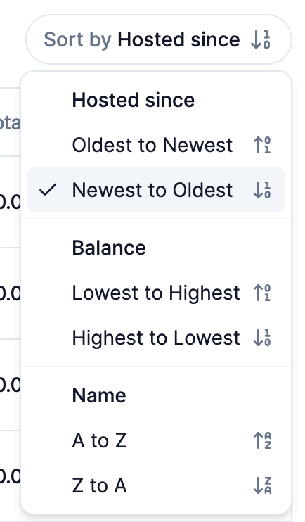 You are able to sort by Hosted since (Oldest - Newest), Balance (Lowest - Highest) and Name (A - Z).