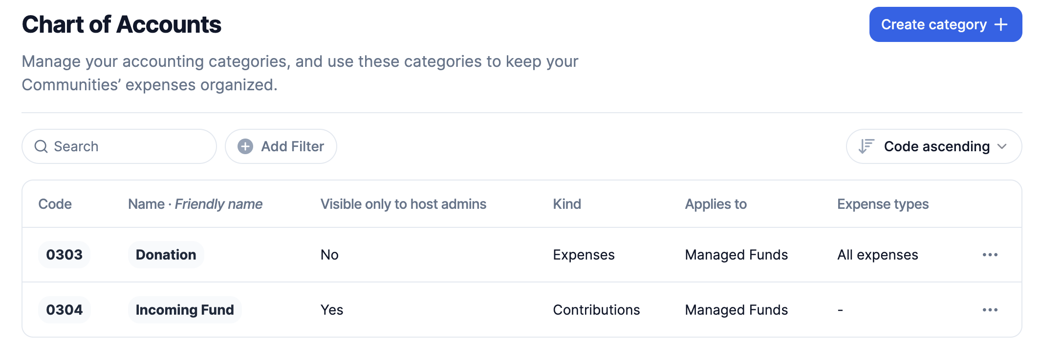 As a fiscal host admin, you can define your chart of accounts by navigating to **Dashboard > Settings > Chart of accounts**. The table will let you add, remove, and edit entries.