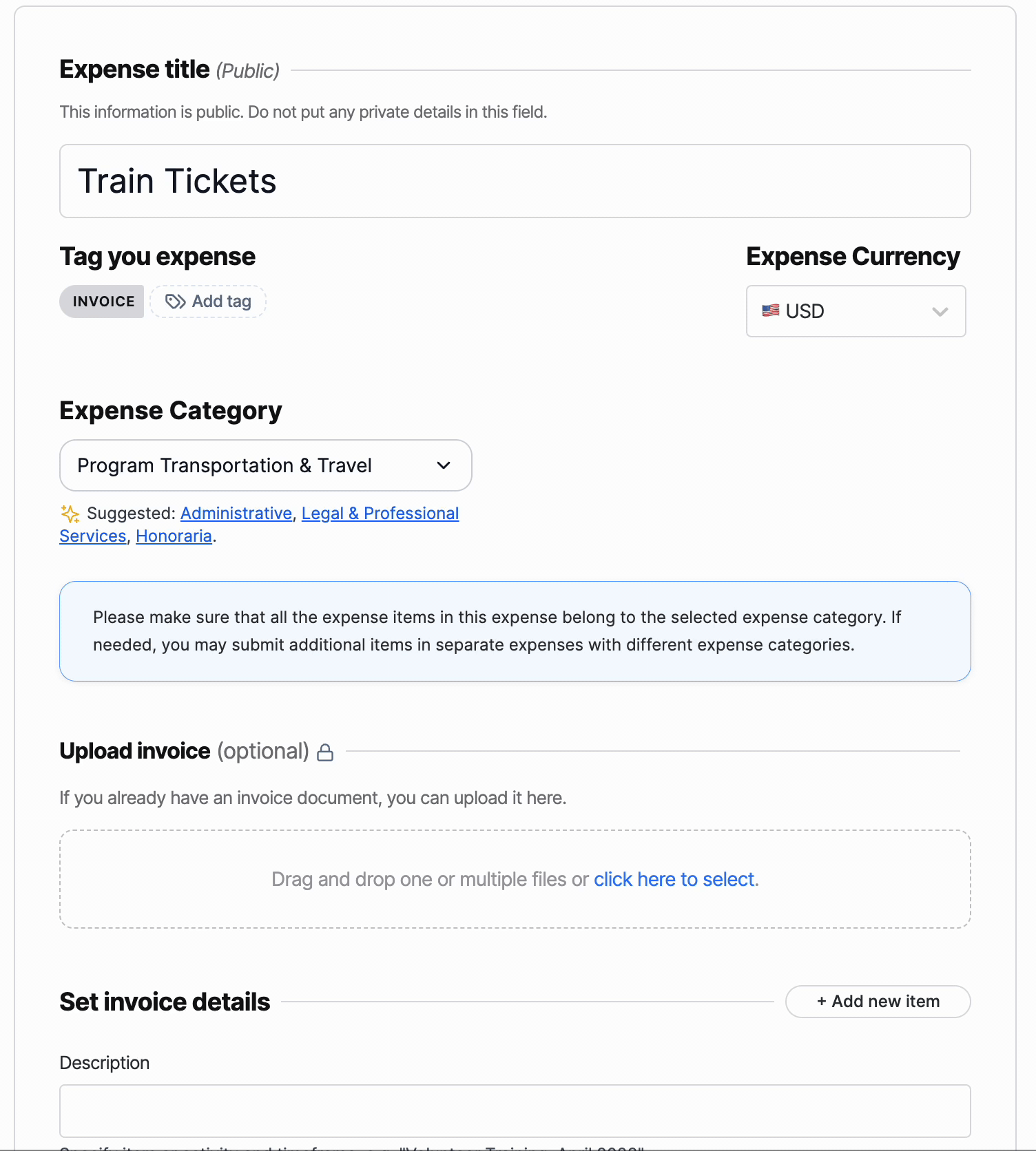 If this policy is enabled, expense submitters will be presented with an input field (required) to choose an expense category before submitting the expense. This helps ensure that expenses are properly categorized from the outset.
