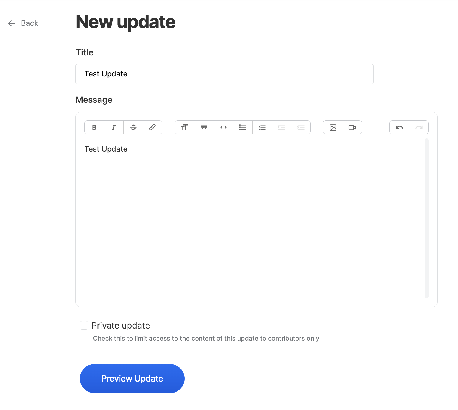 Updates is a way to keep your community posted on your progress. They are sent by email to all your communities, contributors and followers and displayed on your page.