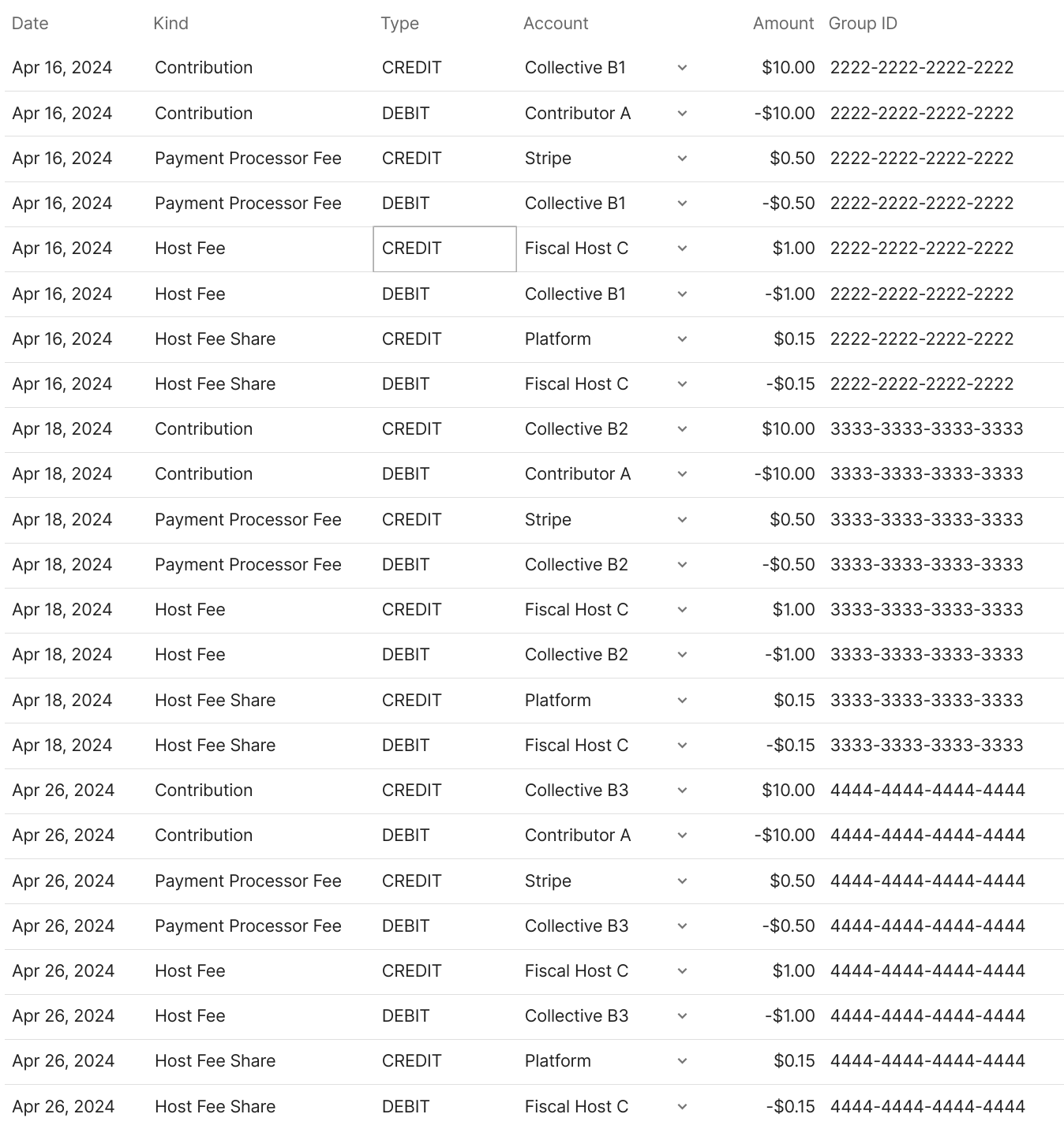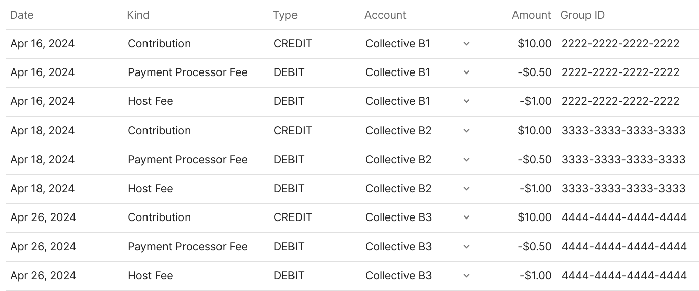 Therefore, the fiscal host ledger includes a large and more complex set of transactions. Lets take the following example where three communities hosted by the fiscal host each receive each one contribution. This results in three groups of transactions:
