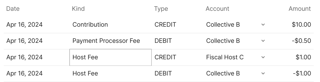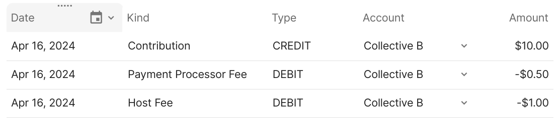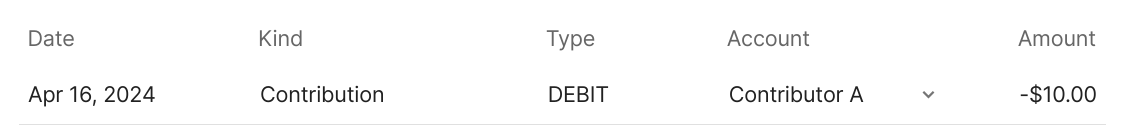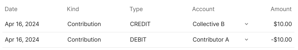 Different users sees a different perspective of the same ledger. The perspective a user sees depends on the account through which they are looking at the ledger. Typically each account sees only transactions related to it. Fiscal hosts are an exception since they see both their own transactions and the transactions of the communities they host.In the above contribution example, the contributor will see just one transaction - their contribution debited from their account: