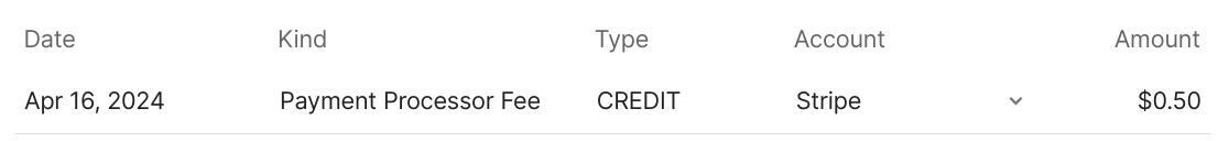 The Stripe account (though it has no users, there is a global Stripe account to which transactions are attributed) will show just the payment processor fee that it charged:
