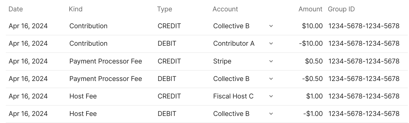 Usually transactions are created in groups that have a shared context. For example, when a contribution is made by Contributor A via Stripe to Community B that is hosted by Fiscal Host C the following transaction group will be created: