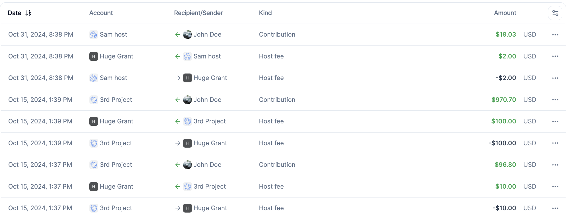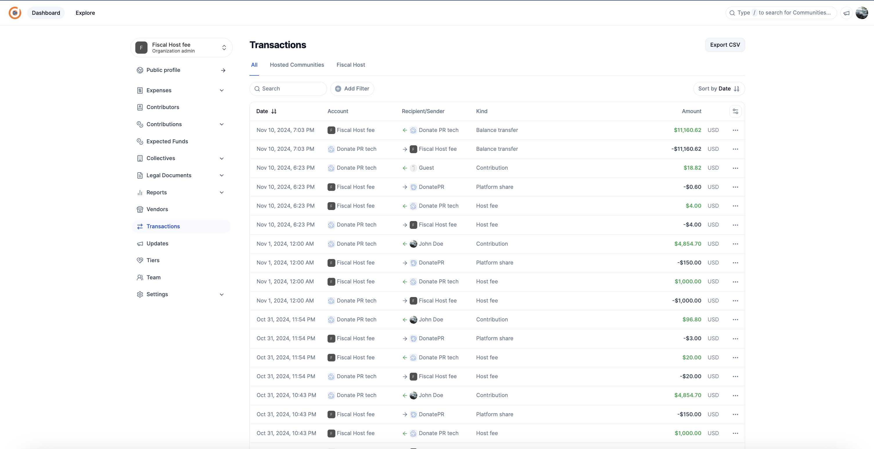 3. If you are a fiscal host administrator you will see all of your organizational transactions and all the transactions related to the communities you host.