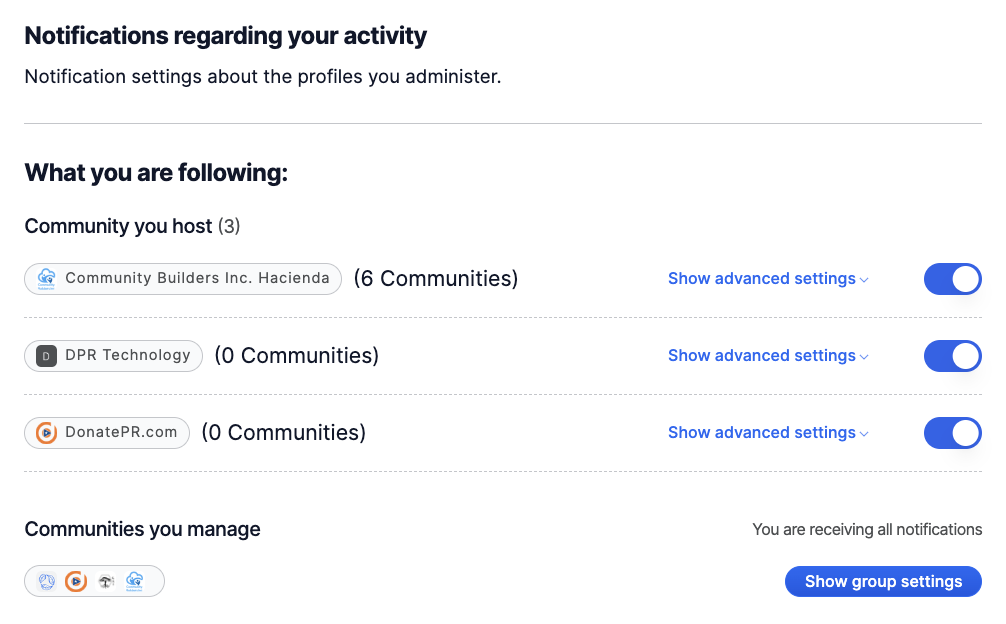 On the ***Communities you host*** group, you'll find all the communities you're a core contributor to next to the host's main notifications toggle switch. This switch will let you disable all the non-transactional notifications triggered by this host and its hosted communities.