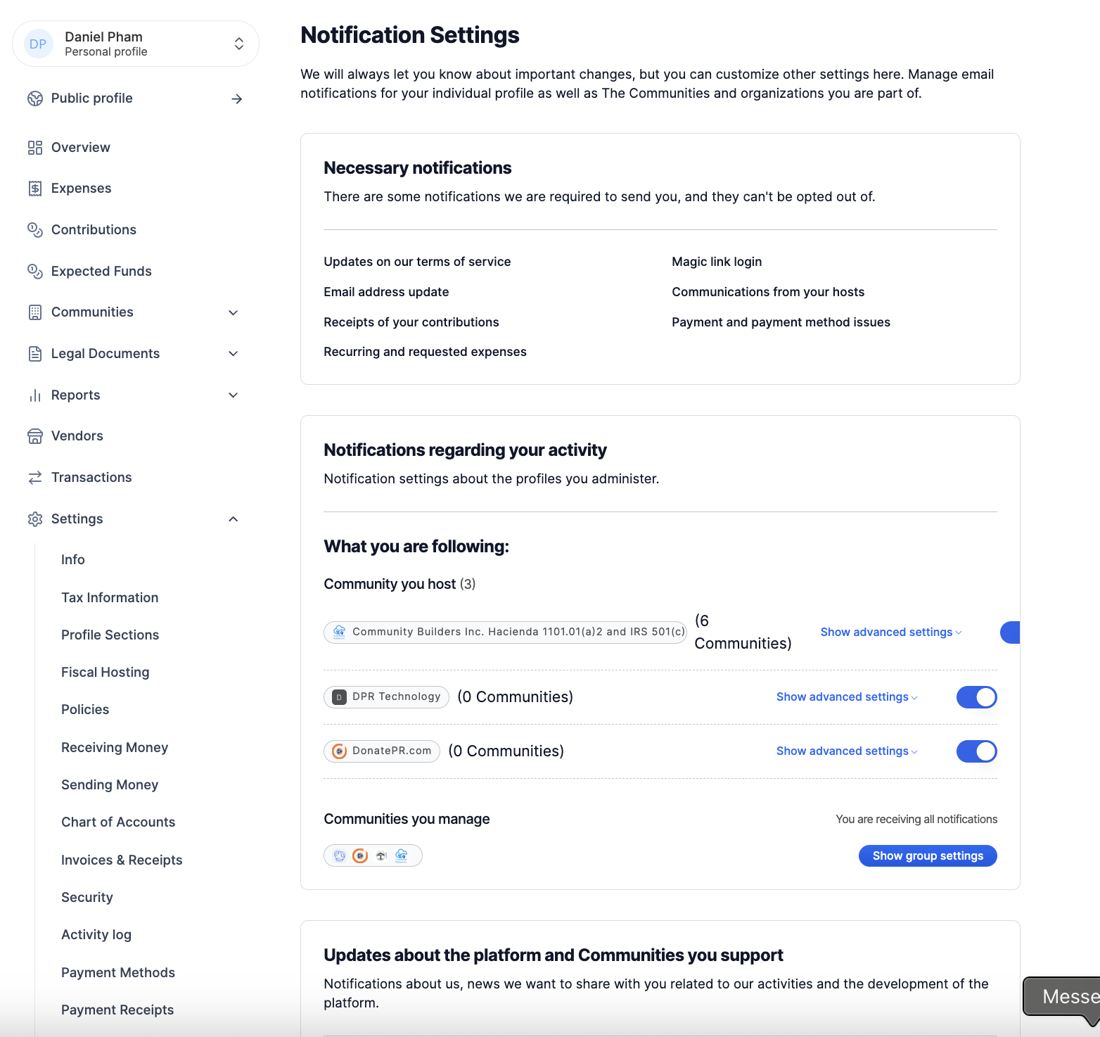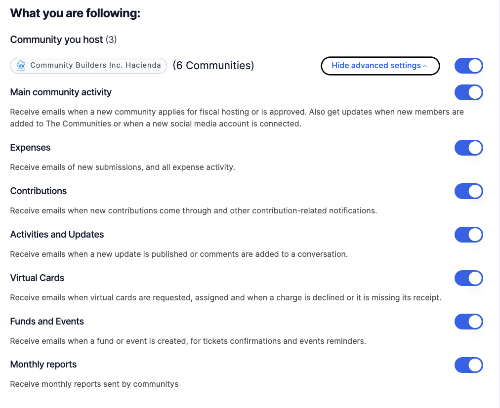 * **Communities you host:** These are the notifications you receive as the admin of a fiscal host. This includes all the notifications relevant to the fiscal-host admin that may have been triggered by the host or any of the communities you're hosting.