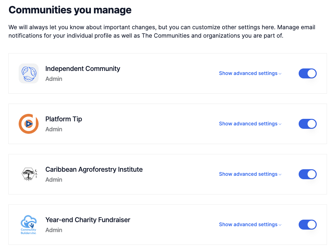 To manage email notifications for your individual profile as well as the communities and organizations you are part of, you can open the *Notifications Settings* page that you can find in your *Account Settings*